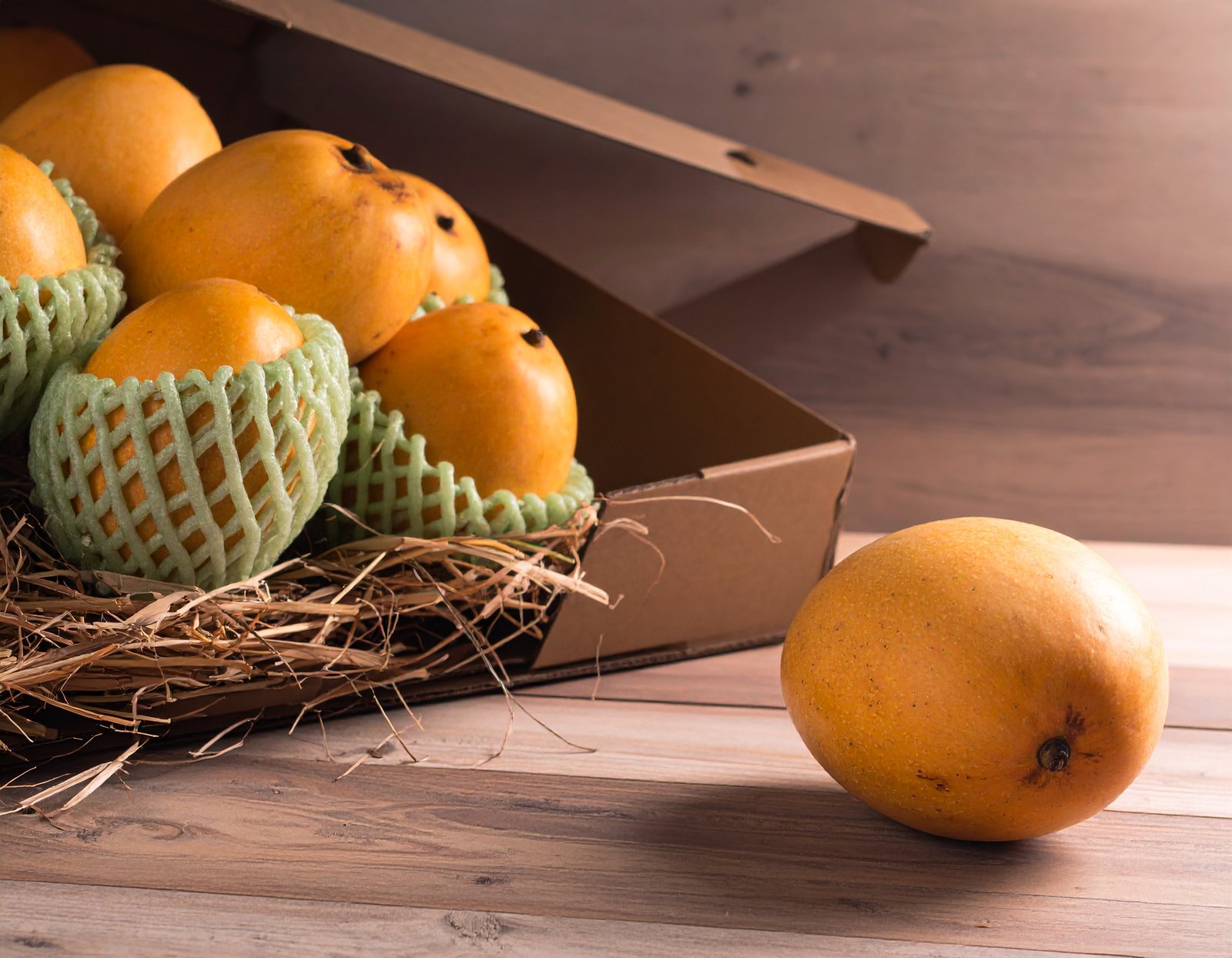 Each mango is individually wrapped in a soft foam net sleeve that cushions the fruit against physical impact and prevents skin-to-skin contact — the most common cause of bruising during courier handling. Wrapped mangoes are then placed in compartmentalized trays inside five-ply corrugated cardboard boxes — a box construction strong enough to withstand stacking pressure during courier transit without transmitting that pressure to the fruit inside.